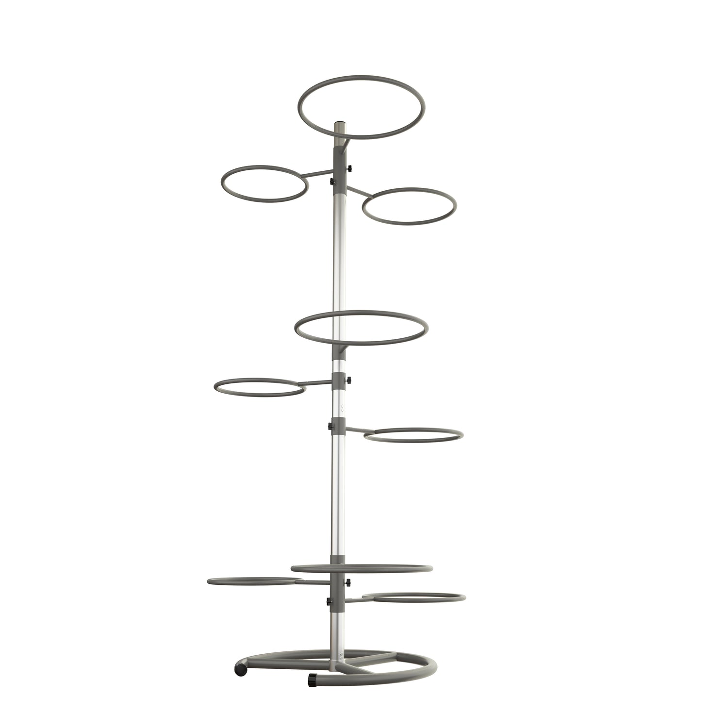 El cuerpo central está fabricado en acero grueso con tubo de 2.8 cm, recubierto con pintura anticorrosiva para garantizar durabilidad y resistencia frente a la humedad. Su base circular de 60 cm y los aros de 46 cm brindan soporte firme para balones de 45 a 75 cm de diámetro, manteniéndolos siempre seguros y accesibles. La altura total de 184 cm aprovecha la verticalidad sin comprometer estabilidad.