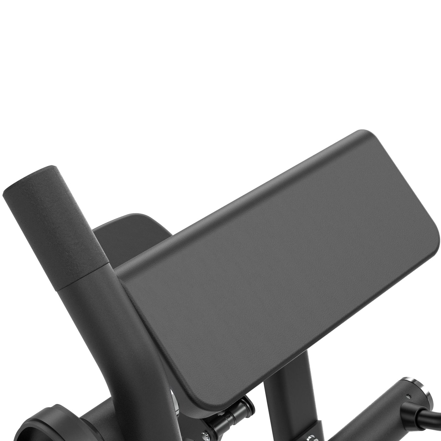 El pad superior ancho y anatómico posiciona el antebrazo de forma estable, manteniendo el codo alineado con el eje de rotación durante todo el recorrido. Esta configuración mejora la eficiencia del gesto y reduce compensaciones del hombro, algo clave al trabajar con volumen, tempos controlados o cargas progresivas.