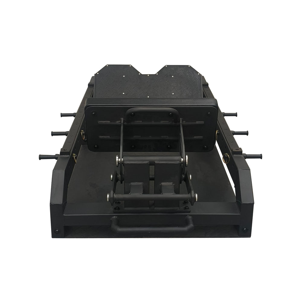 La plataforma de pies regulable, montada sobre rodamientos lineales, amplía las variaciones disponibles para modificar ángulo, profundidad y tensión del movimiento. Este ajuste permite orientar el estímulo desde un thrust tradicional con énfasis global hasta una variante elevada con mayor carga sobre glúteo mayor y femoral, disminuyendo la participación del cuádriceps en la extensión final.