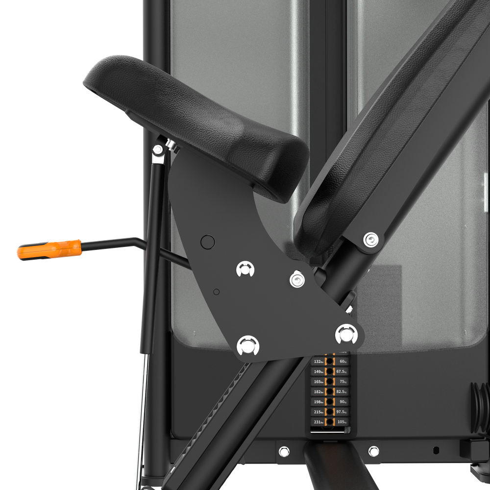 El respaldo regulable en 5 posiciones y el asiento con asistencia neumática permiten encontrar el ángulo exacto para cada biotipo, manteniendo pelvis estable y escápulas libres para rotar donde corresponde. La cremallera de ajuste asegura que el asiento no “ceda” ni milímetros bajo carga, manteniendo el seteo idéntico entre usuarios o a lo largo de múltiples series. En sesiones con superseries o cambios de variante, los ajustes se hacen con una mano sin perder tiempo.