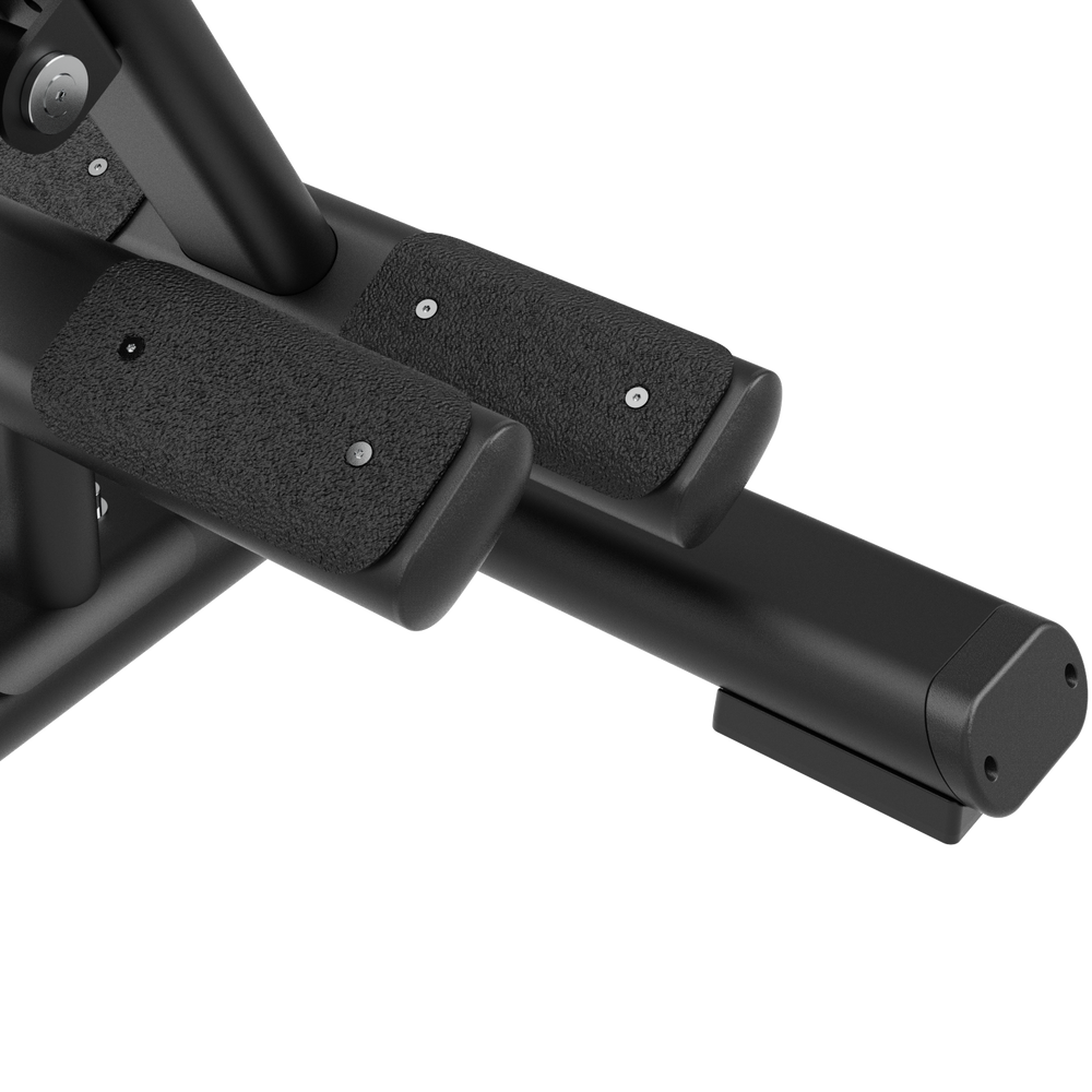 El equipo añade elementos prácticos pensados para el uso diario en sala. La palanca de tracción incorpora una manga de carga alargada de Ø48 × 300 mm, lo que facilita montar la resistencia deseada con discos grandes sin topar con los topes del equipo, manteniendo el equilibrio del conjunto y la seguridad del usuario. En la zona de apoyo inferior, el banco integra dos pedales antideslizantes con altura seleccionable, de modo que personas con diferentes estaturas consigan el ángulo de cadera y rodilla correcto para una tracción limpia. Todo esto, sumado a superficies fáciles de limpiar, transforma al banco en una estación de espalda lista para alta rotación sin sacrificar precisión mecánica.