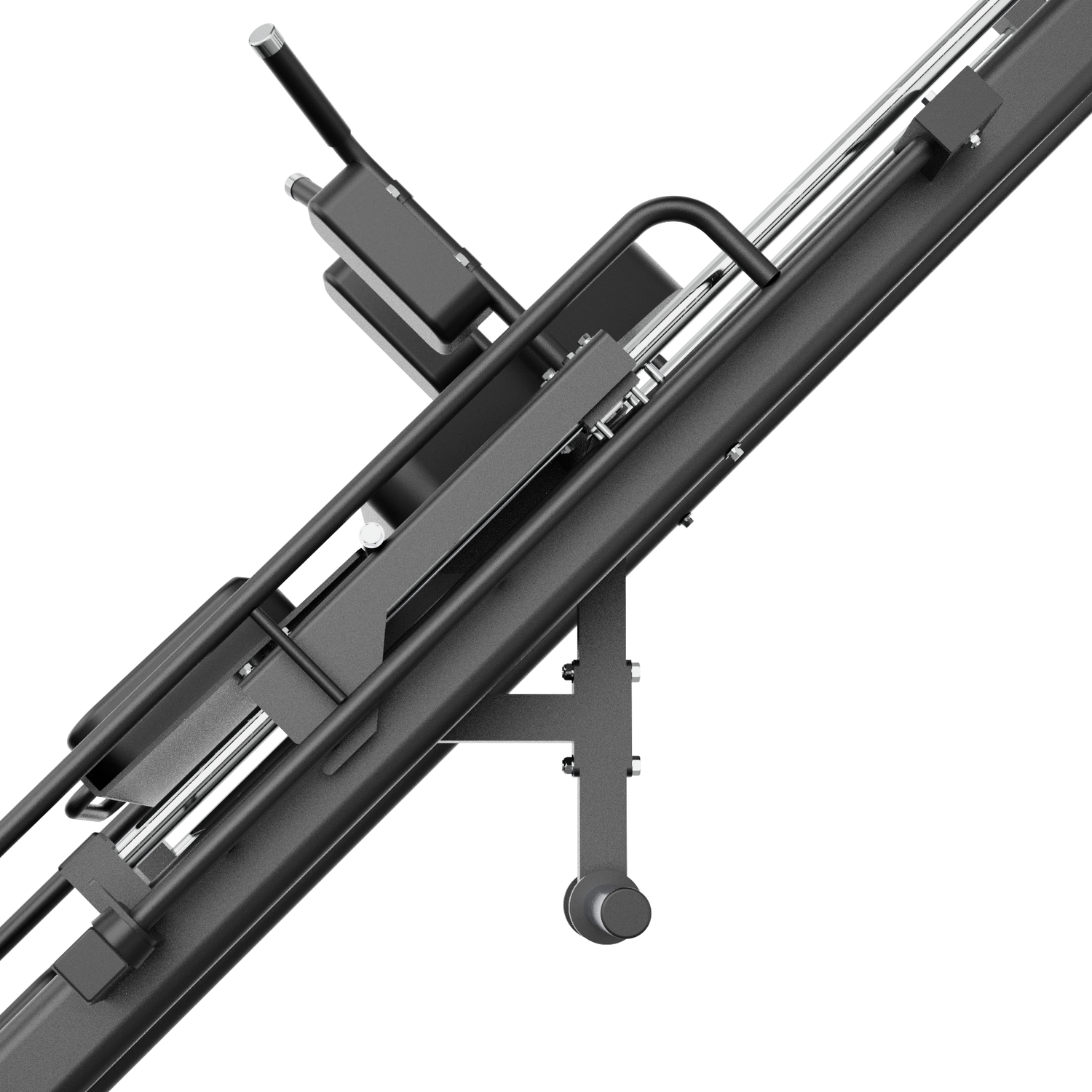 El sistema de guías lineales autoalineadas a 45° sostiene el carro sin juego, logrando un recorrido uniforme desde la flexión hasta la extensión. Esta linealidad cuida la rodilla y la cadera, evitando torsiones cuando la carga sube y permitiendo tempos específicos —excéntricos controlados, pausas y concentraciones— sin que el equipo “jale” fuera de trayectoria. El resultado es una curva de fuerza predecible que simplifica trabajar por porcentajes, RIR o RPE, y que mantiene igual la sensación de un microciclo a otro.