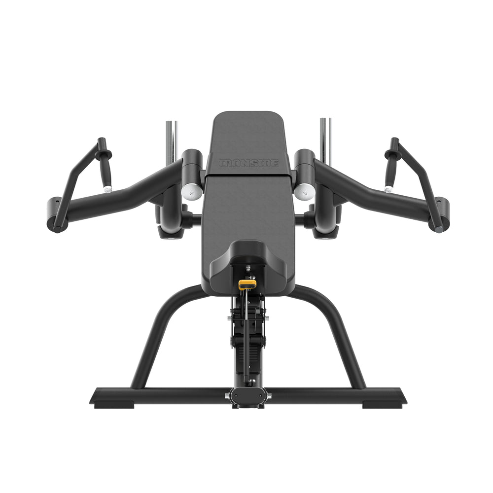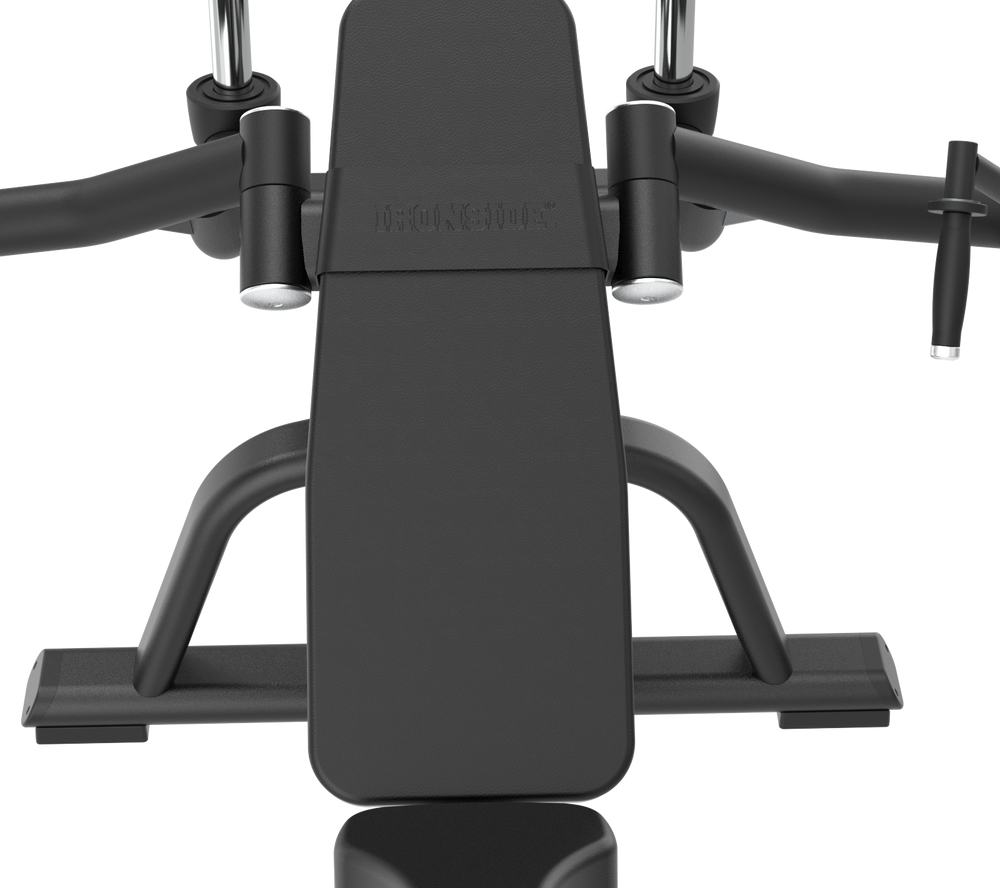 Asiento asistido por gas para ajuste rápido; agarres 360° que mantienen muñeca neutra; brazo adaptativo para entrega de resistencia estable; respaldo ergonómico que estabiliza escápulas y tronco; chasis estable para uso intensivo y progresión medible con discos.