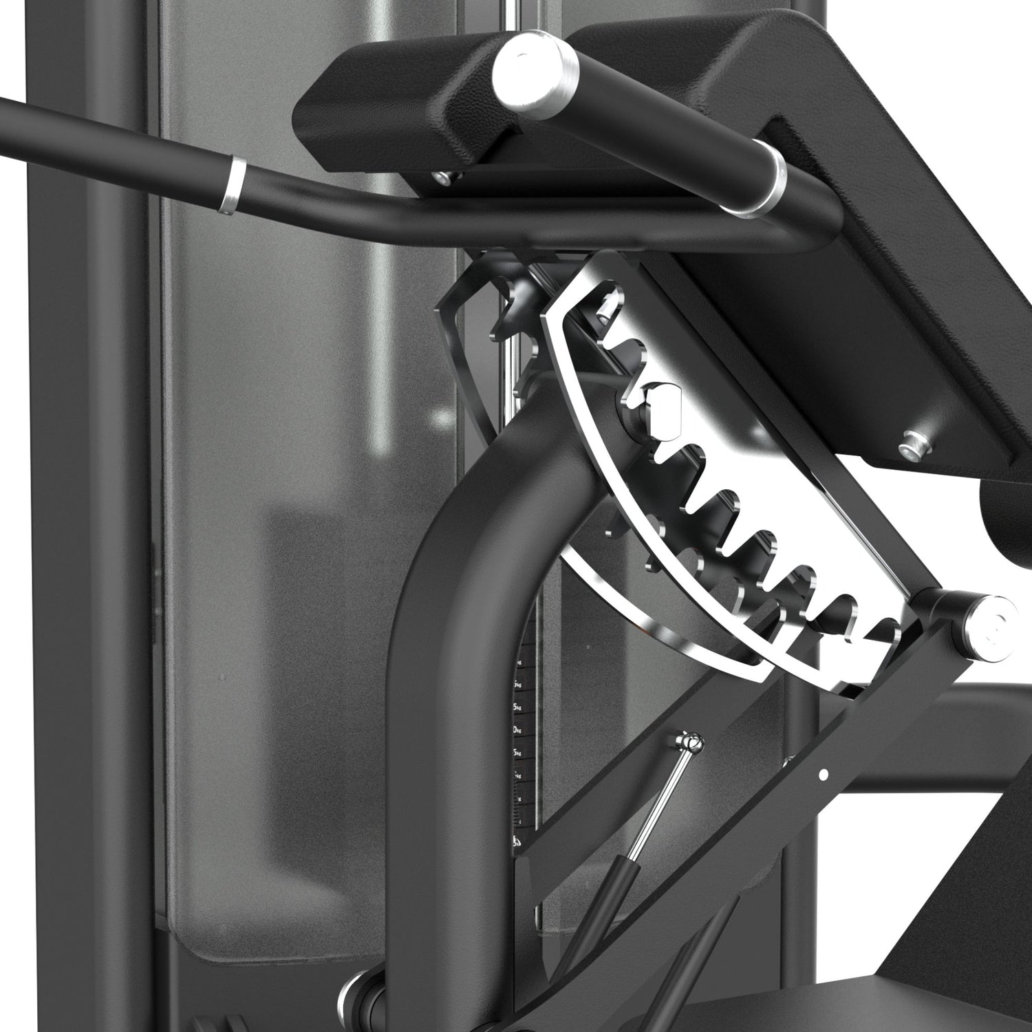 La estación integra un pad de muslos con 9 posiciones y asistencia neumática que facilita la puesta a punto sin perder tiempo entre series. El bloqueo del fémur es estable, amplio y cómodo, lo que minimiza desplazamientos de la pelvis y evita compensaciones en la zona lumbar cuando el trabajo se hace pesado. El brazo de fuerza acompaña el arco natural del tronco, de modo que la carga se siente continua, sin “zonas muertas” ni tirones, y el usuario puede enfocarse en mantener columna neutra y tensión del core durante todo el recorrido.