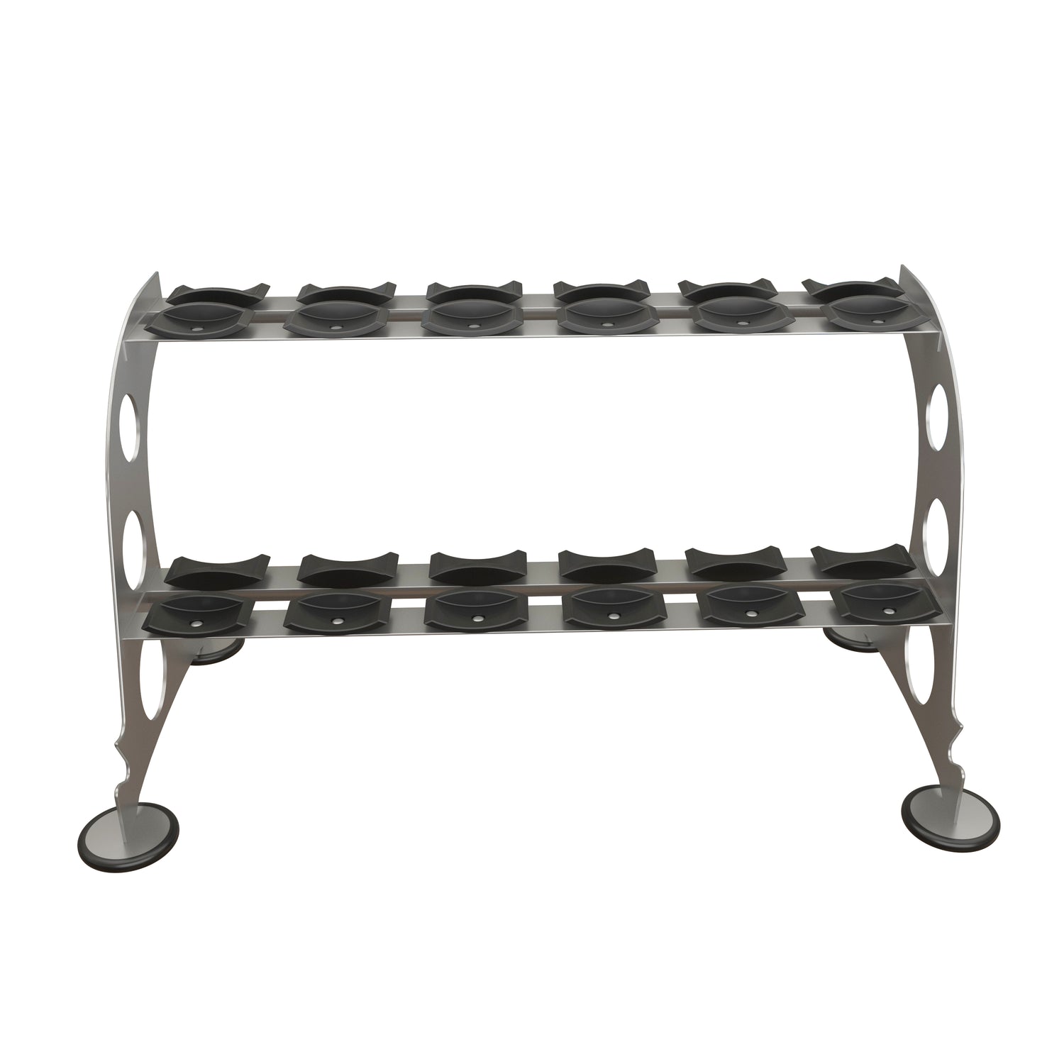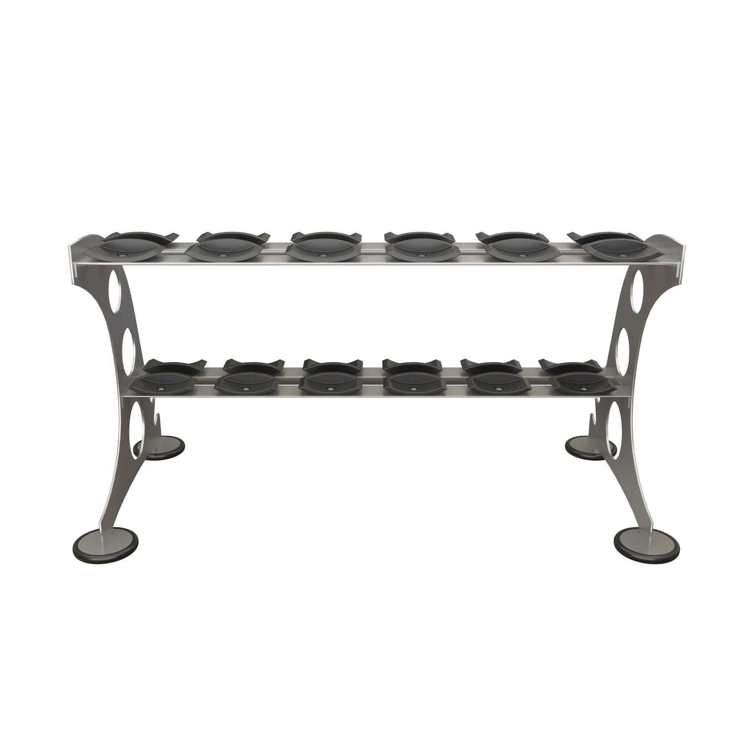 Seis pares con acceso frontal y lateral para manipulación ágil. La distribución en dos niveles facilita separar rangos de peso y estandarizar el orden, de modo que cada atleta ubica su par sin recorrer la sala ni cruzarse con otros usuarios. La forma de las cunas guía la colocación de la mancuerna sin forzar la muñeca y con una trayectoria natural, reduciendo el riesgo de pequeños golpes que terminan dañando recubrimientos o suelos.