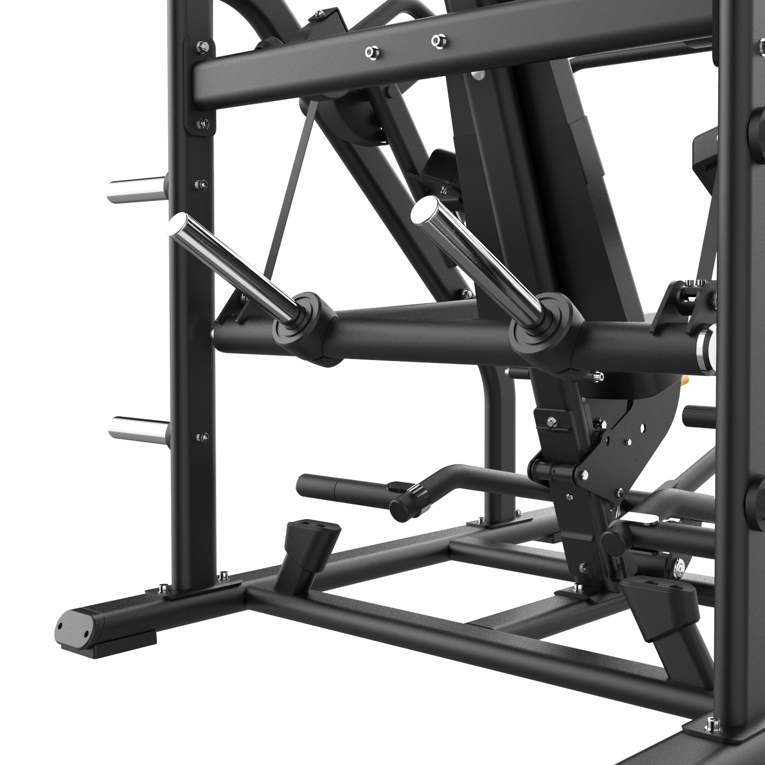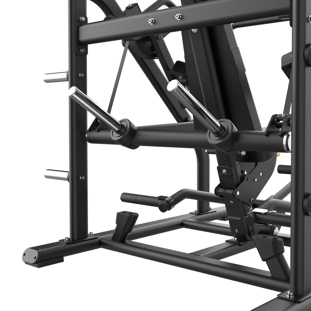 Desde el chasis hasta los puntos de contacto, todo está orientado a la ejecución técnica y la seguridad. El asiento regulable, el multigrip y la palanca de arranque con el pie permiten posicionarte fino, iniciar cada repetición desde una zona segura y liberar la escapular sin estrés en hombros. La capacidad de carga de hasta 300 kg y los cuatro pernos de almacenamiento agilizan el flujo de entrenamiento y mantienen ordenada la zona de trabajo, algo clave en salas con alta rotación.