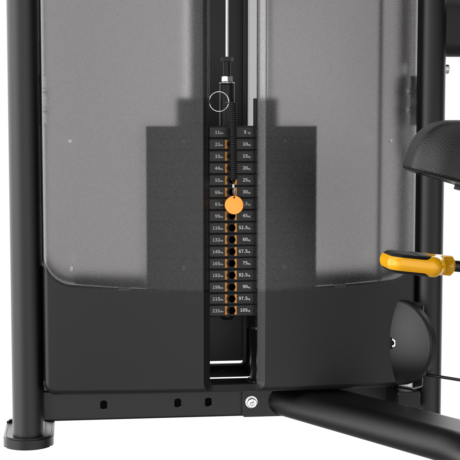La carga selectorizada de 105 kg de weight stack, accionada por pin selector, asegura incrementos finos y replicables sin desviaciones del recorrido. El cableado y las poleas de baja fricción sostienen una resistencia uniforme durante todo el arco de movimiento, por lo que el atleta percibe tensión continua en la fase concéntrica y control estable en la excéntrica, clave para ganar masa y fuerza en el bíceps de manera segura.