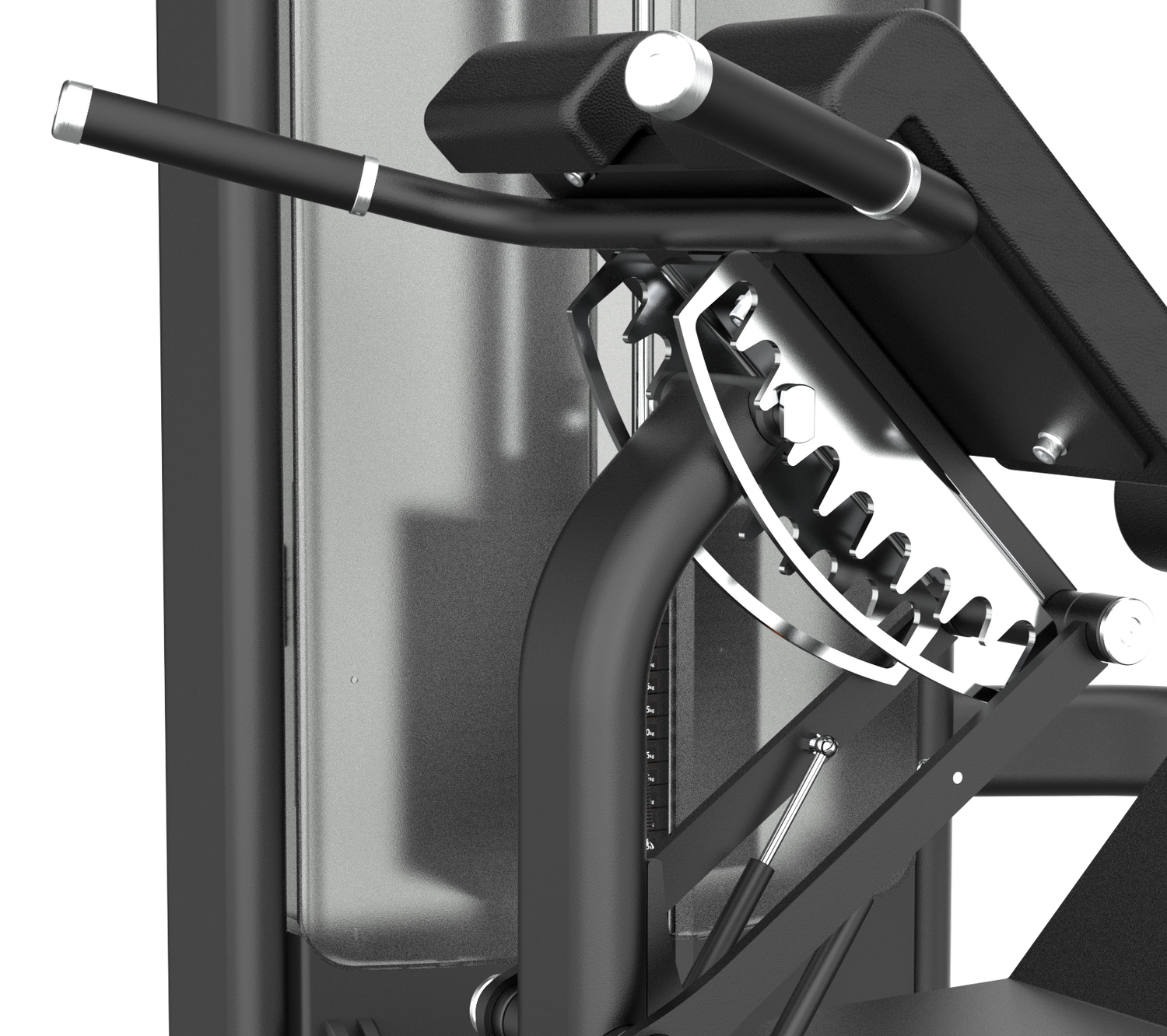La estación integra un pad de muslos con 9 posiciones y asistencia neumática que facilita la puesta a punto sin perder tiempo entre series. El bloqueo del fémur es estable, amplio y cómodo, lo que minimiza desplazamientos de la pelvis y evita compensaciones en la zona lumbar cuando el trabajo se hace pesado. El brazo de fuerza acompaña el arco natural del tronco, de modo que la carga se siente continua, sin “zonas muertas” ni tirones, y el usuario puede enfocarse en mantener columna neutra y tensión del core durante todo el recorrido.