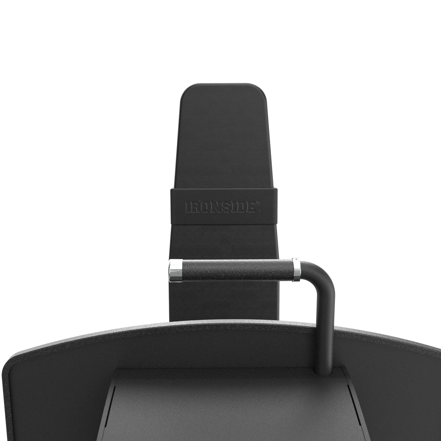 El acceso es sencillo gracias al peldaño antideslizante y a los manerales auxiliares que estabilizan el tronco mientras se ajustan postura y discos. El tope de seguridad se acciona con una palanca de alta visibilidad y bajo esfuerzo, de modo que el límite inferior del recorrido se configura en segundos para proteger rodillas y cadera sin recortar ROM útil.