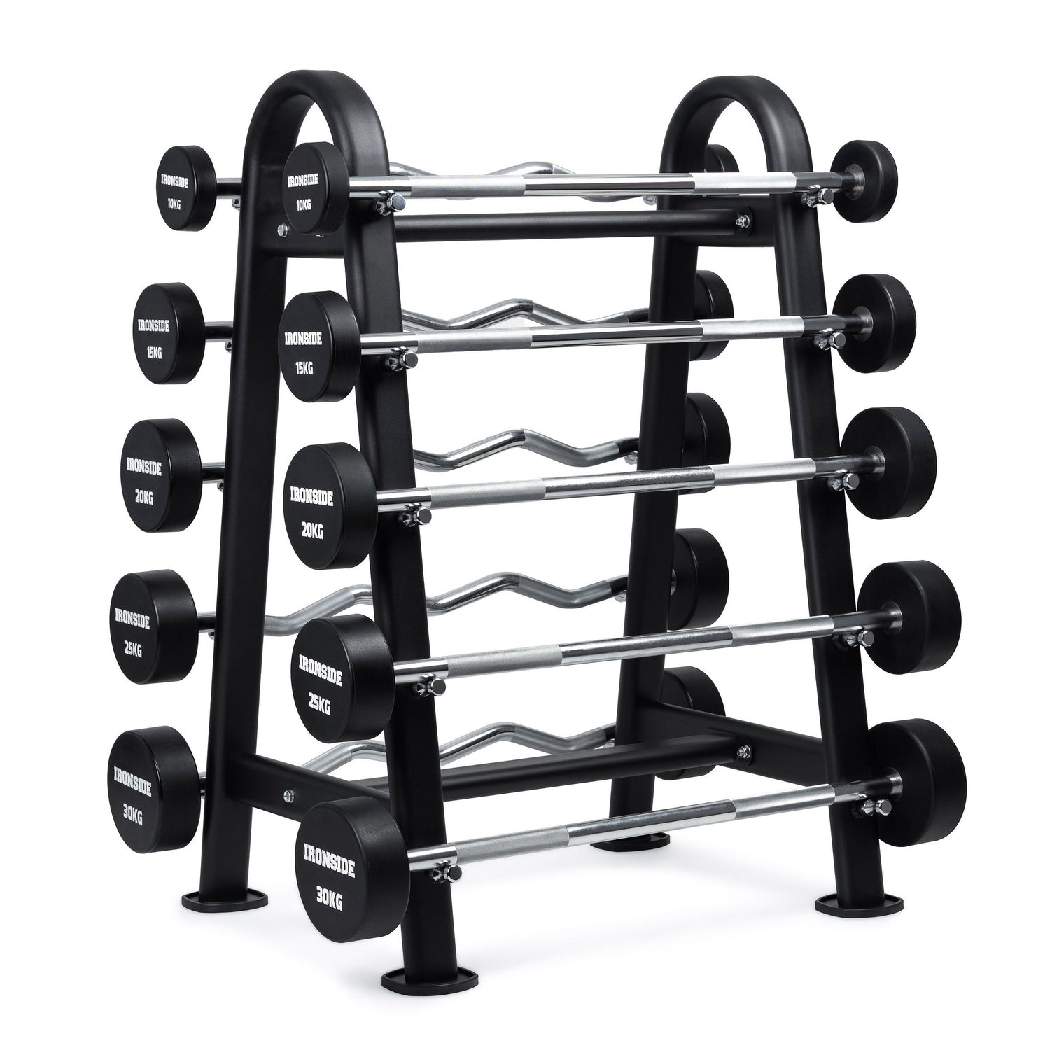 Este set está compuesto por 10 barras precargadas IRONSIDE, que combinan 5 barras rectas y 5 barras EZ, con un rack de almacenamiento diseñado para mantener el orden, accesibilidad y seguridad en espacios de entrenamiento.