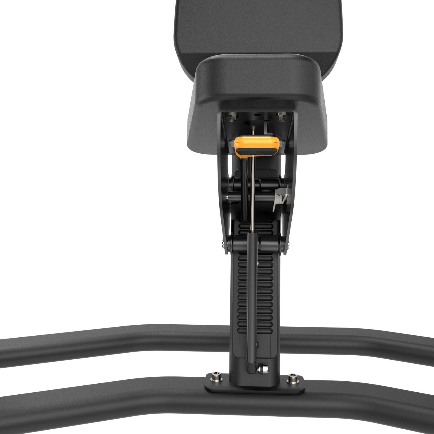 El asiento cuenta con regulación de altura asistida por pistón a gas, lo que permite adaptarlo con facilidad a distintos tamaños de usuario, asegurando que el press se ejecute con la alineación ideal entre hombros y agarres. El acolchado está fabricado con espuma de alta densidad recubierta en vinilo cosido, ofreciendo soporte firme y cómodo incluso en entrenamientos prolongados.