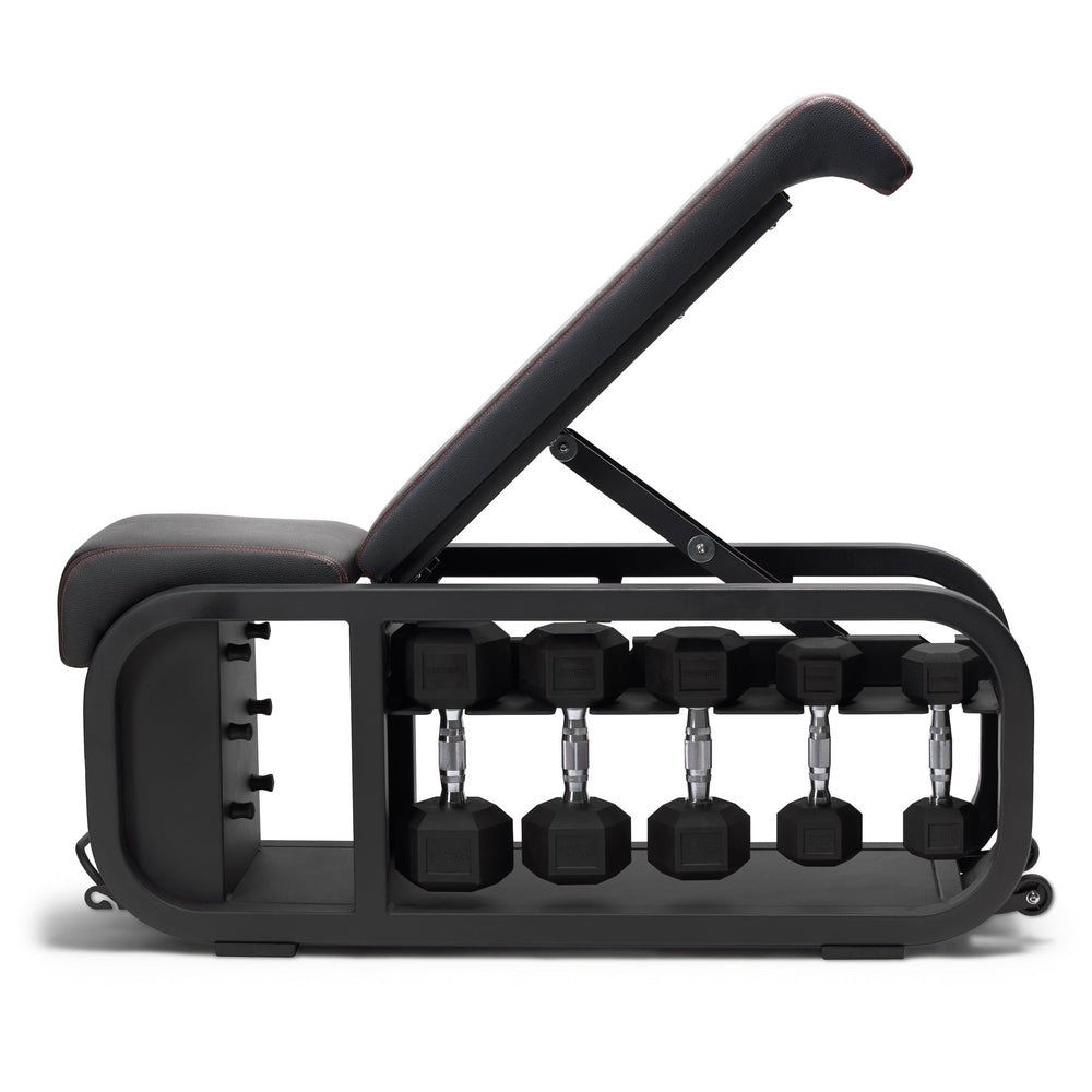 Este banco incluye un práctico espacio de almacenamiento para hasta 5 pares de mancuernas (no incluidas), permitiéndote mantener tu área de entrenamiento organizada. Ideal para usuarios de home gym, este compartimento facilita el acceso rápido a las pesas y asegura un espacio limpio y ordenado.