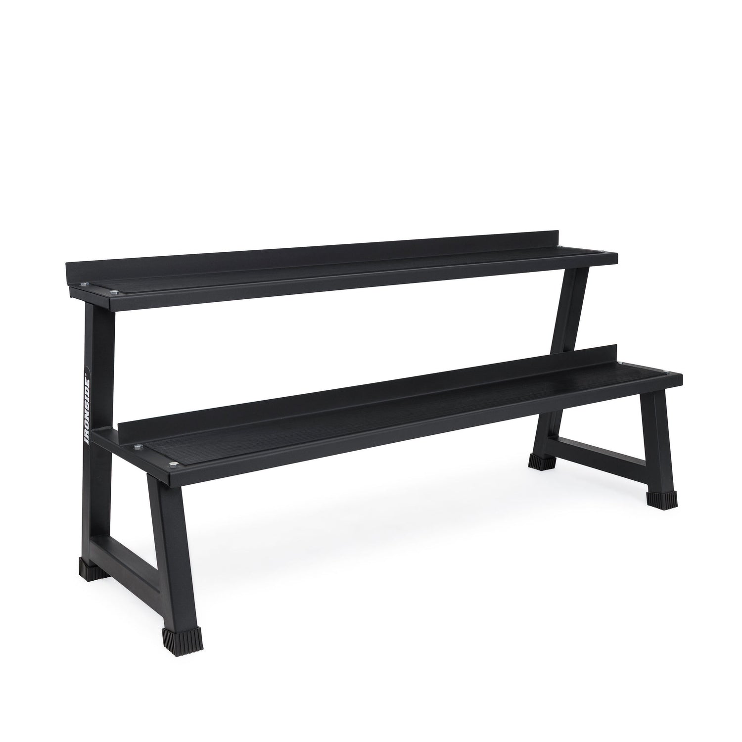 El rack incluido está fabricado en acero de alta resistencia, diseñado para almacenar hasta 400 kg de kettlebells. Sus dos bandejas en forma de escalones facilitan el acceso a las pesas, manteniendo el espacio de entrenamiento organizado y seguro.